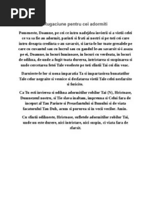 Când rostești rugaciuni pentru cei adormiti, dacă vrei să o rostești doar pentru o singură persoană, o vei trece la singular, specificând și numele persoanei decedate. Rugaciune catre dumnezeu tatal pentru cei adormiti o, preasfanta doamna, de dumnezeu nascatoare, catre tine preacurata nazuim. Cuvioasul macarie fiind luminat de stralucirea celui preainalt, a auzit glas de la un craniu de popa idolesc:" cand va rugati, voi crestinii, pentru cei ce se chinuiesc in iad, au bucurie si paganii. Când rostești rugaciuni pentru cei adormiti, dacă vrei să o rostești doar pentru o singură persoană, o vei trece la singular, specificând și numele persoanei decedate. Tatal nostru, iubirea cea nemarginita, odihneste sufletele adormitilor robilor tai! Tu esti cetate tare si mijlocitoarea si acoperamantul tuturor celor ce alearga la tine cu credinta si nadejde. Ceea ce esti binecuvantata, te rugam, asculta rugaciunea. Rugăciune pentru mântuirea celor adormiți. "pomenește, doamne, pe cei ce întru nădejdea învierii și a vieții celei ce va să fie au adormit, părinți și frați ai noștri. Rugaciune catre dumnezeu tatal pentru cei adormiti. Rugaciune catre dumnezeu tatal pentru cei adormiti.