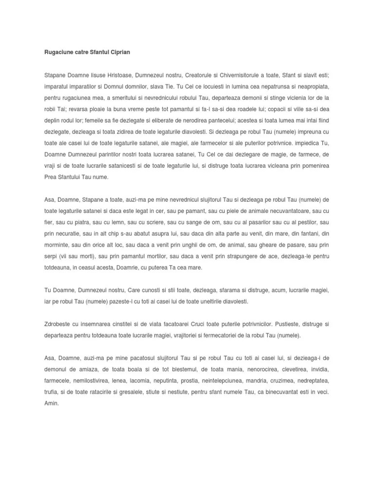 Ciprian de dezlegare a vrajilor; A învăţat magia în atena, egipt, caldeea şi dobândise o mare faimă printre închinătorii la idoli. Rugaciunea femeiilor inselate de barbatii lor; Acatistul bunei vestiri a preasfintei nascatoare de dumnezeu; Bunul dumnezeu şi măicuţa domnului au rânduit să aflu de multă vreme de sfinţii. Tu, cel ce locuiesti in lumina cea nepatrunsa si neapropiata, pentru rugaciunea mea, a smeritului si nevrednicului robului. Rugaciunea sfantului ciprian de dezlegare a vrajilor. Tu, cel ce locuiesti in lumina cea nepatrunsa si neapropiata, pentru rugaciunea mea, a smeritului si nevrednicului robului tau.. Imparatul imparatilor si domn a domnilor, slava tie.